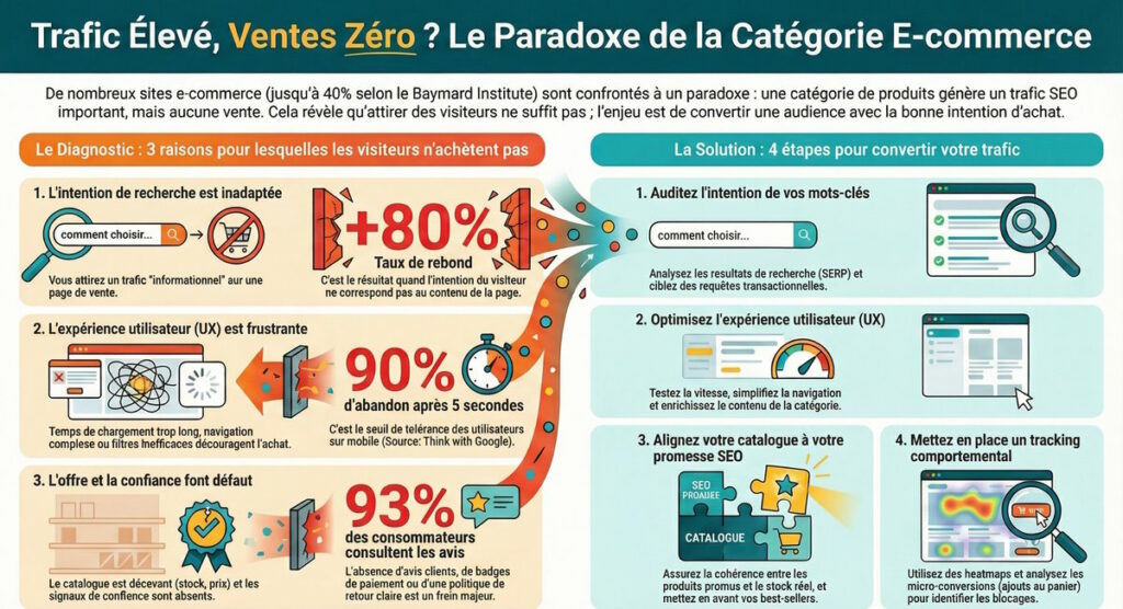 Vous observez des centaines de visiteurs mensuels sur une catégorie produit, mais vos conversions restent désespérément à zéro. Ce paradoxe frustrant révèle une vérité inconfortable : le trafic SEO sans intention d'achat ne génère aucun chiffre d'affaires. Cette dissonance entre visibilité et performance commerciale toucherait 40% des sites e-commerce selon une étude Baymard Institute 2024.
